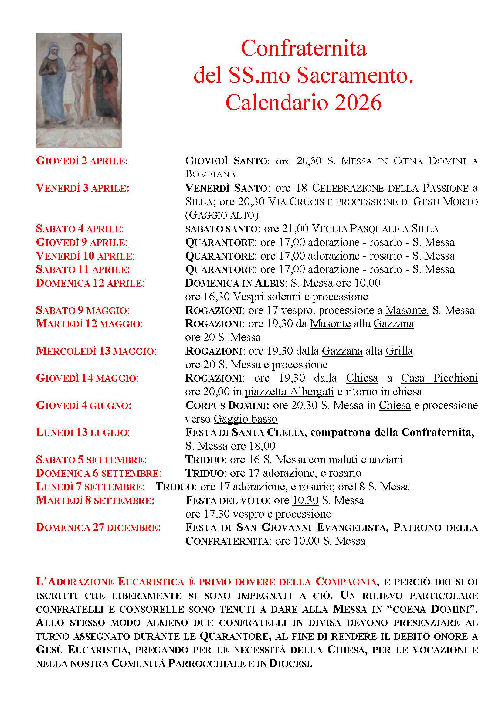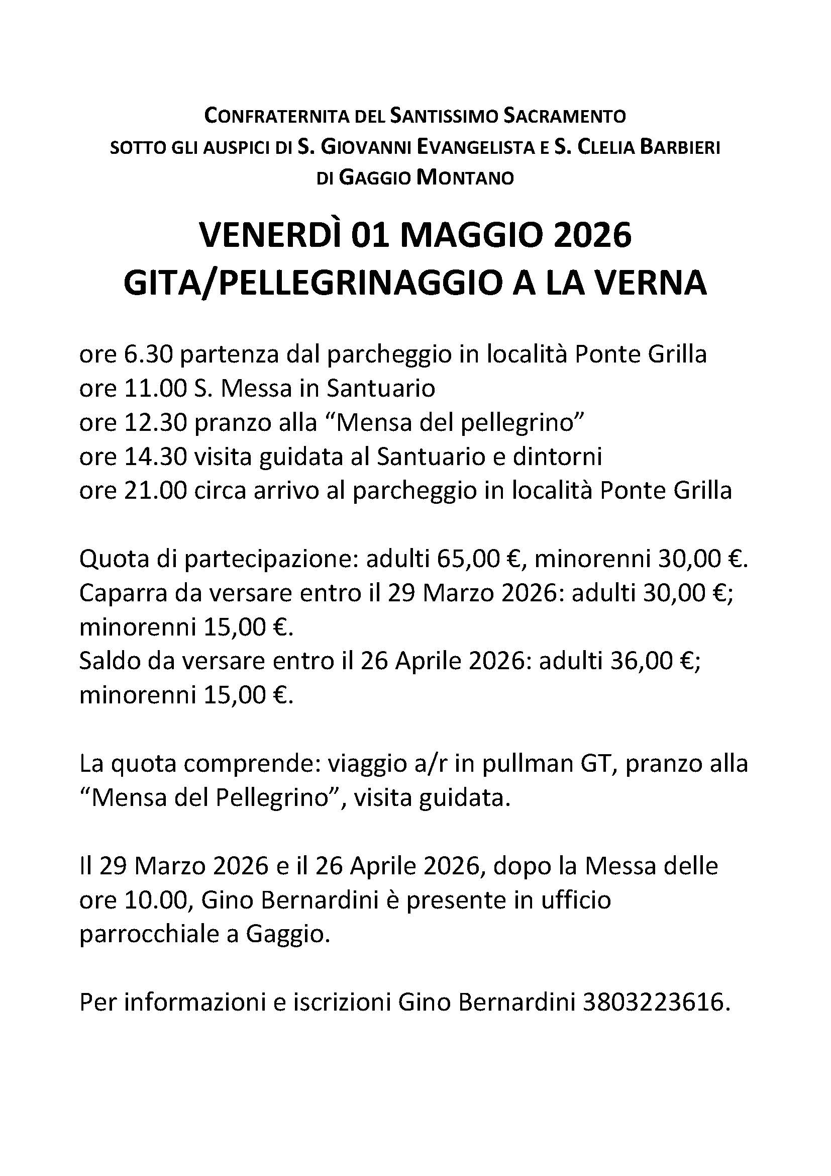 Venerdì 01 Maggio 2026 pellegrinaggio/gita, organizzato dalla Confraternita del SS. Sacramento e aperto a tutti, a La Verna. Iscrizione entro il 29 Marzo 2026. Per informazioni e prenotazioni Gino Bernardini 3803223616.